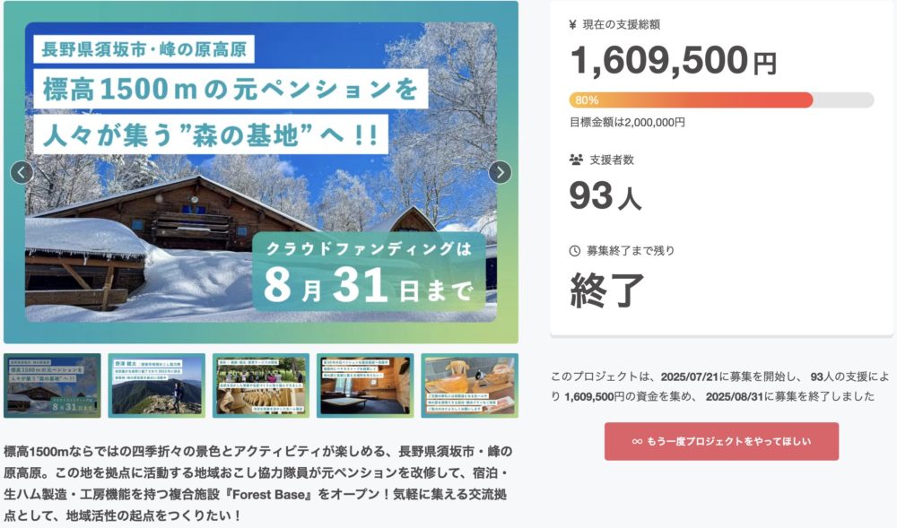 昨日まで挑戦していたクラウドファンディング「天空のヴィレッジ・峰の原高原に人々が集う”森の基地”をつくりたい!」が終了しました。